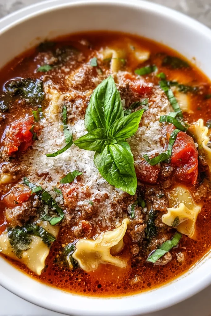 Beyond its comforting appeal, this soup shines as a versatile lunch or dinner option that feeds a crowd or makes stellar leftovers. With 450 calories per serving and generous portions for six, it’s both nourishing and indulgent in all the best ways. The blend of ground beef and Italian sausage builds a savory foundation, while crushed tomatoes and a hint of tomato paste add that signature tangy sweetness. Fresh spinach and basil bring bright, green freshness that balances the richness of triple cheeses—ricotta, mozzarella, and parmesan. Trust me, once you try this beginner-friendly recipe, it’ll earn a permanent spot in your weekly rotation.