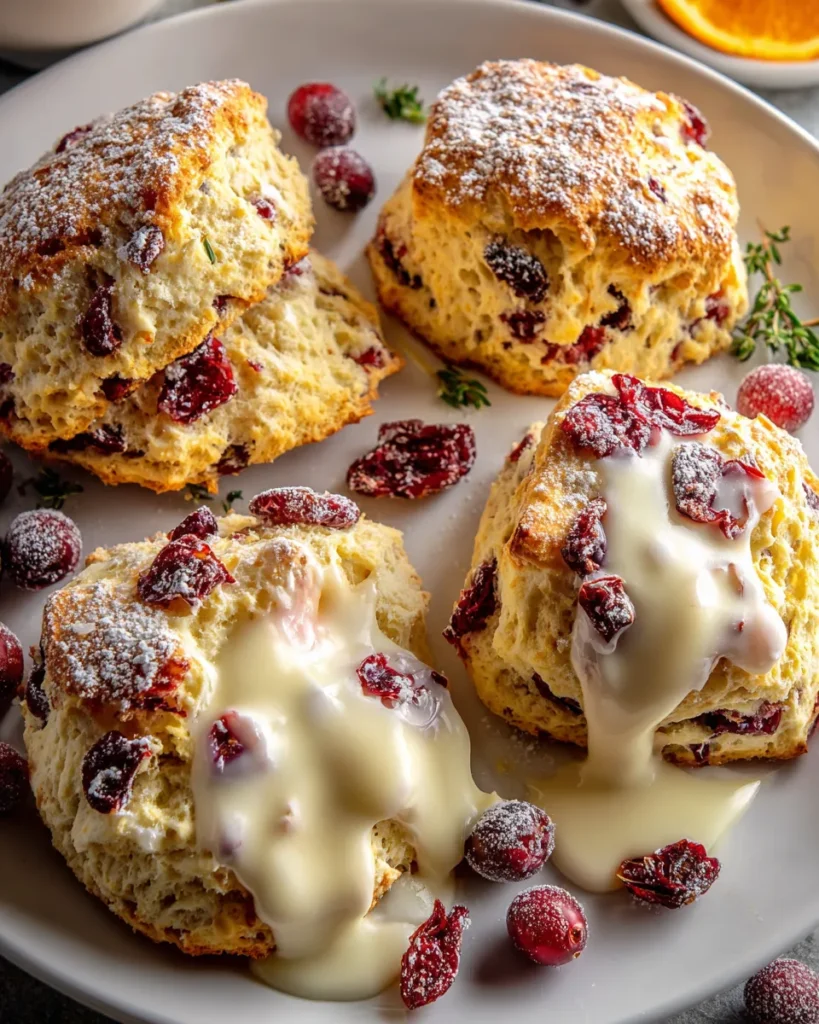 Flaky golden scones studded with tart cranberries and vibrant orange zest, enriched with rich cream and vanilla.