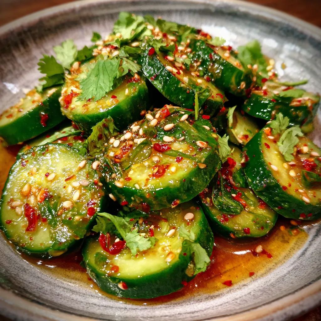 Crisp cucumber ribbons soak up a zesty mix of rice vinegar, soy sauce, and chili, creating a bright, spicy salad topped with cilantro and toasted sesame seeds. A cool, fiery side dish ready in minutes.